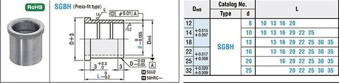 Bạc vai dẫn hướng SGBH20-30 là linh kiện khuôn mẫu quan trọng trong khuôn đột dập, khuôn ép nhựa và khuôn cơ khí chính xác, dùng kết hợp với trục/chốt dẫn hướng để đảm bảo khuôn đóng mở đúng tâm. Nhờ thiết kế có vai (flange), bạc giúp cố định chắc chắn trong tấm khuôn, giảm ma sát, hạn chế mài mòn và tăng tuổi thọ cho toàn bộ bộ khuôn.