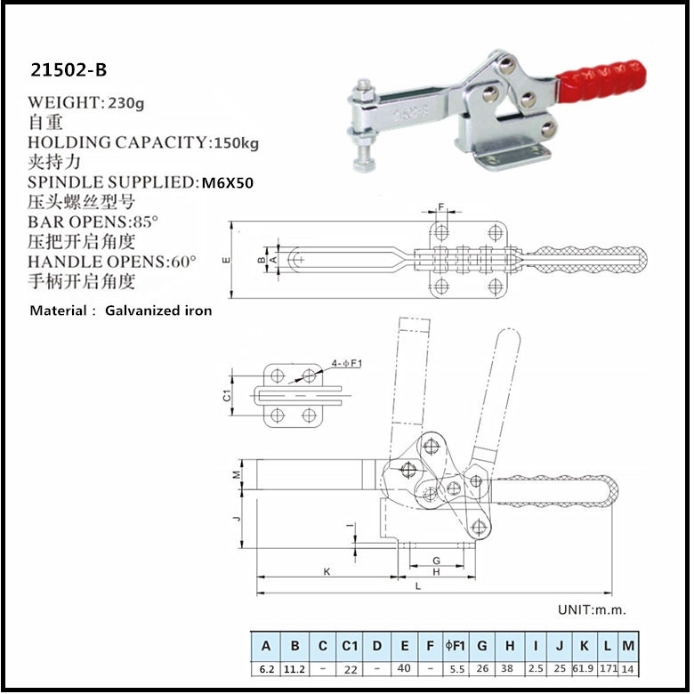 - Kẹp định vị GH-21502-B Horizontal Toggle Clamp là loại cam kẹp ngang được sử dụng trong công nghiệp làm gá kẹp nhanh sản phẩm, kẹp kiểu ngang nghĩa là ở trạng thái giữ sản phẩm thì tay cầm của kẹp song song với bề mặt sản phẩm kẹp.