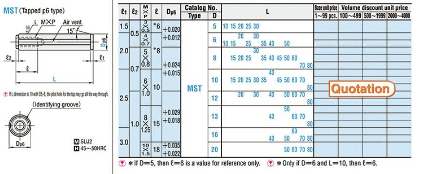 Chốt định vị MST12 đường kính thân 12mm, tiêu chuẩn thiết kế với sai số p6. Mã MST với thiết kế lỗ ren âm thông minh giúp kỹ thuật viên sử dụng bu lông (thường là M6) để xoáy vào và kéo chốt ra khỏi lỗ khuôn một cách dễ dàng và chính xác, ngay cả khi chốt được lắp chặt trong các chi tiết máy dày.