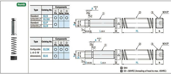 GLH là chốt nâng có thể thay đổi thông số L (chiều dài) và A (kích thước làm việc) theo thiết kế khuôn.
