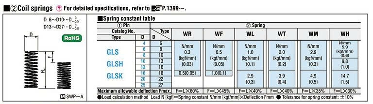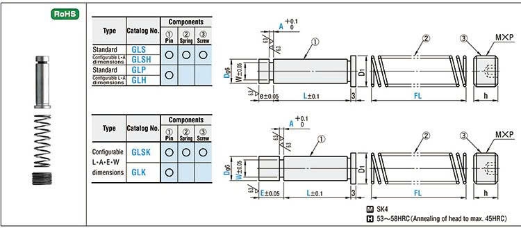 Chốt nâng dẫn hướng GLS6 được thiết kế-gia công theo chuẩn misumi gồm chốt nâng, lò xo, vít cố định với kích thước D-L-A-WF sau: