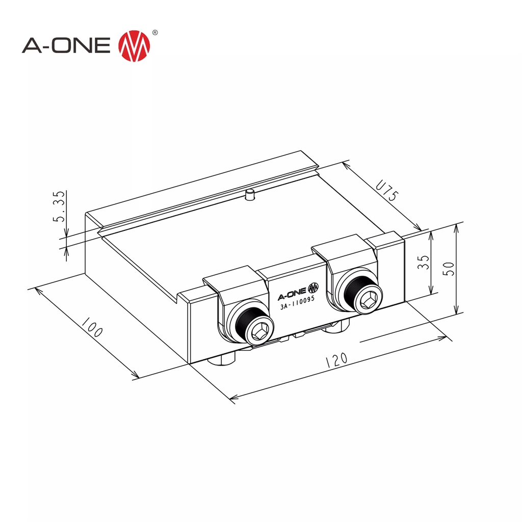 Đầu kẹp dạng nêm U75 A-ONE 3A-110095 kích thước 120×100×35mm, bề rộng nêm 75mm, góc 45°, dùng chuẩn G-Plate. Lực kẹp mạnh, tối ưu cho gia công 5 mặt và các chi tiết kim loại kích thước trung bình – lớn.