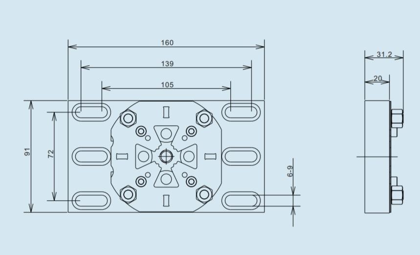 Thiết kế bề mặt 160×91mm, kết hợp lắp bằng 6 vít M8 từ phía đáy, giúp đế gá giữ chắc, ổn định và an toàn trong điều kiện gia công tải cao.