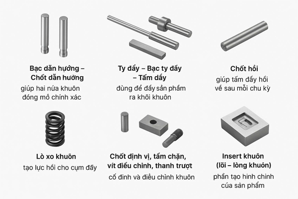 Bạc dẫn hướng – Chốt dẫn hướng: giúp hai nửa khuôn đóng mở chính xác.