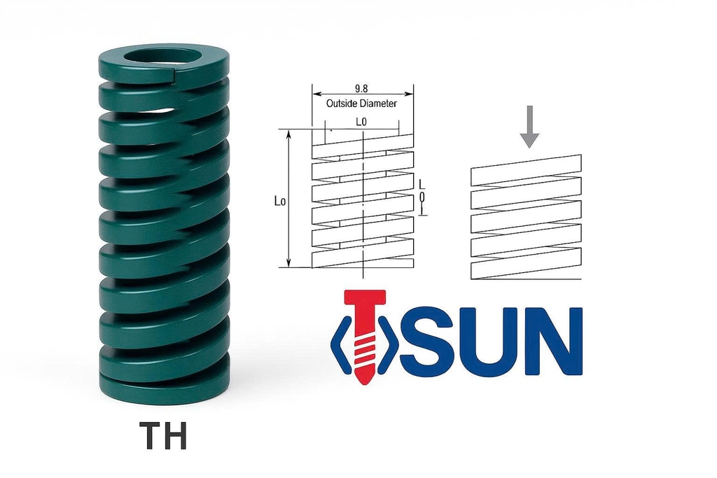Lò xo khuôn mẫu TH (xanh đậm) thuộc nhóm tải nặng (Heavy Load), được thiết kế để chịu lực nén lớn hơn ba dòng tải nhẹ hơn là TF – TL – TM.