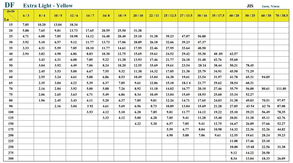 Độ nén tối đa (Max Deflection): Khoảng 40% – 50% chiều dài tự do (tuy nhiên mức khuyến nghị để bền nhất là dưới 25%).