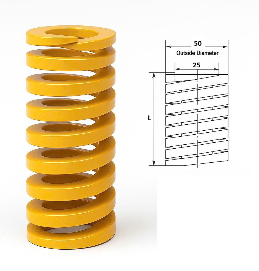 Lò xo khuôn mẫu TF50 (DF50) màu vàng, là dòng linh kiện khuôn mẫu thuộc phân khúc tải trọng siêu nhẹ (Extra Light Load). Với đường kính ngoài tiêu chuẩn 50mm, sản phẩm được chế tạo đặc biệt cho các cơ cấu yêu cầu lực đẩy thấp nhưng đòi hỏi độ nhạy cực cao.