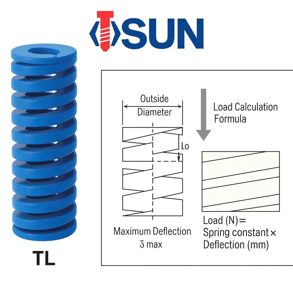 Lò xo khuôn mẫu màu xanh, ký hiệu TL, thuộc nhóm tải trung bình nhẹ (Light-Medium Load), là loại lò xo được dùng rộng rãi trong khuôn ép nhựa và cơ cấu máy móc cần độ đàn hồi cao nhưng không yêu cầu lực nén quá lớn.